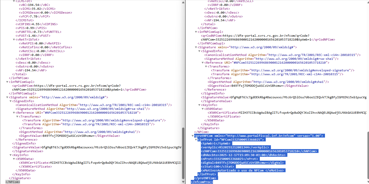Estou com uma reclamação de umas das contabilidades, o suporte nos informou que está incompleta a assinatura digital destes arquivos. As notas geradas aqui na Nuvem Fiscal foram enviadas por e-mail, possuem o prompt da esquerda. E o da direita, é a mesma nota, porém feito o download no site da NFCO…