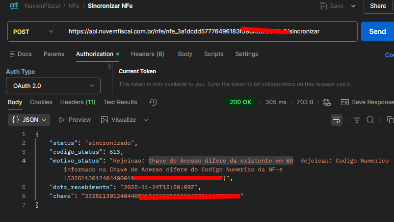 A nota está aprovada mas na nuvem fiscal está dando “motivo_status”: "Rejeicao: Chave de Acesso difere da existente em BD Rejeicao: Codigo Numerico informado na Chave de Acesso difere do Codigo Numerico da NF-e . E isso impossibilita baixar o PDF
