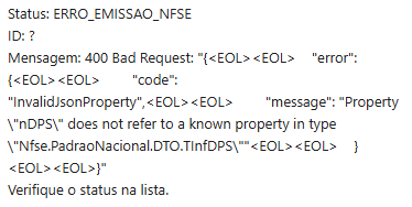 A propriedade nDPS não existe. Remova-a do JSON e tente novamente.