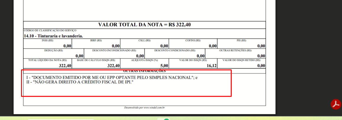 Na tag OutrasInformacoes , tem a obs = I - “DOCUMENTO EMITIDO POR ME OU EPP OPTANTE PELO SIMPLES NACIONAL”; e \s\n II - "NÃO GERA DIREITO A CRÉDITO FISCAL DE IPI.