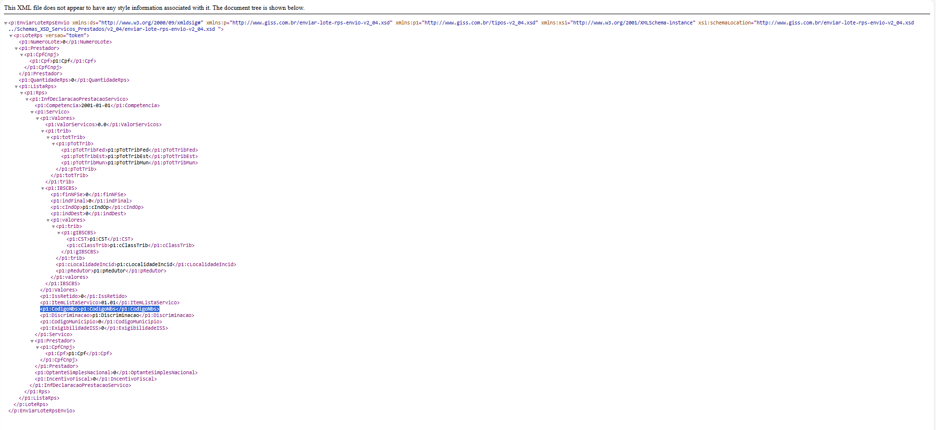 Estou tentando autorizar uma NFSe no ambiente de homologação, mas está dando erro E160 - Falha no Schema XML