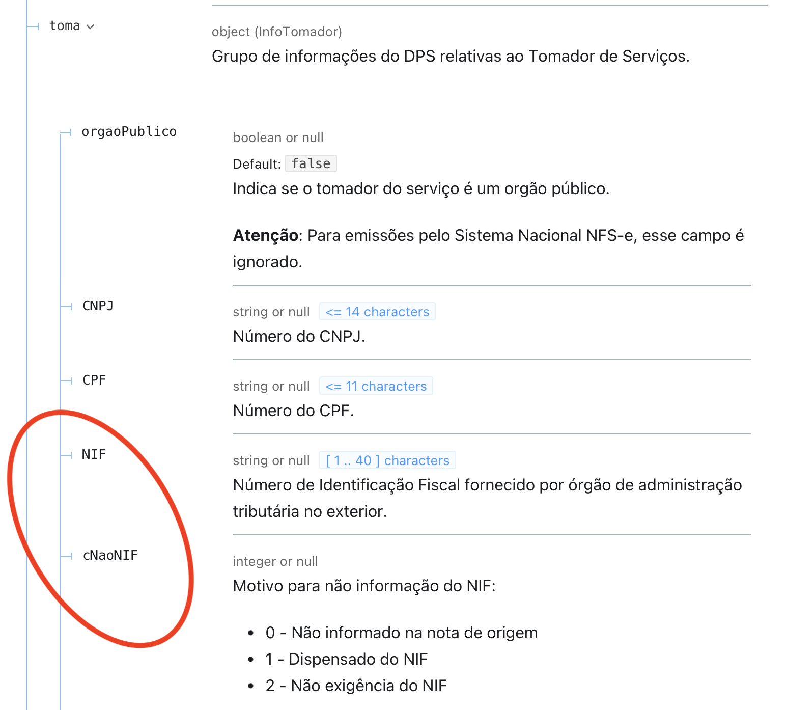 Ali também tem os campos NIF e cNaoNIF que referem-se ao documento do tomado estrangeiro.