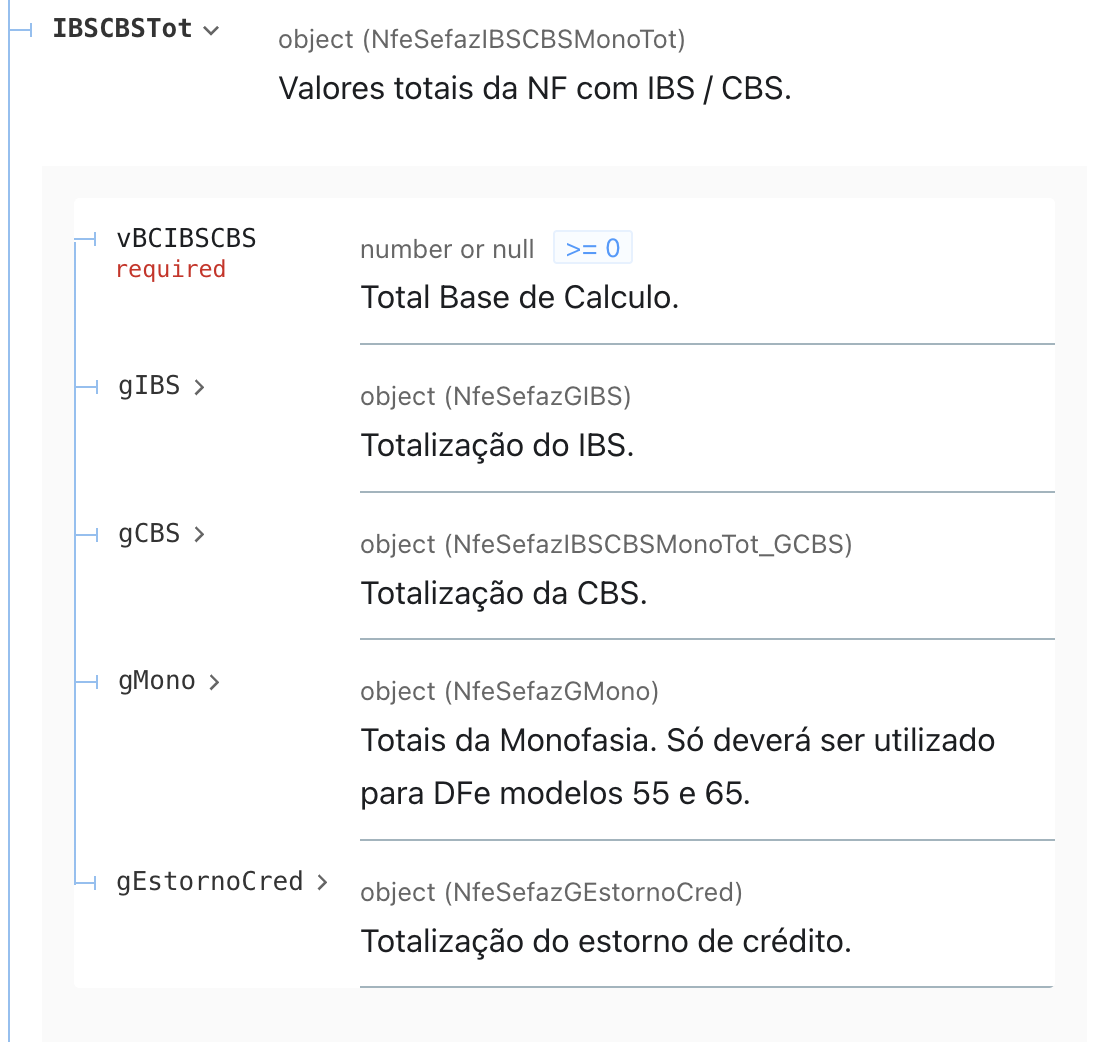 Há também o grupo de totais em infNFe.total.IBSCBSTot: