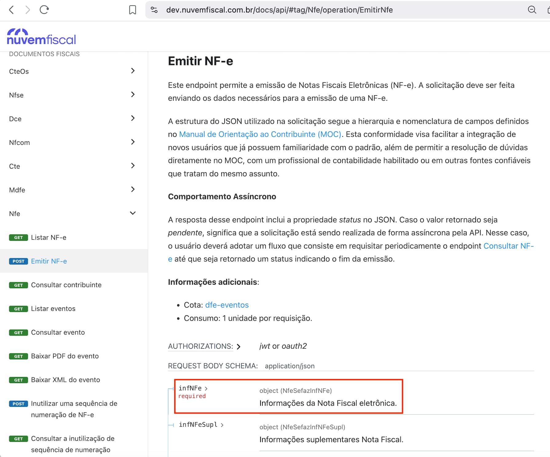 Dentro do endpoint Emitir NF-e, localize o campo infNFe conforme destaque na imagem a abaixo: