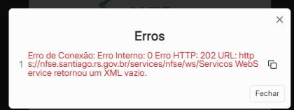 - descricao: “Erro de Conexão: Erro Interno: 0\r\nErro HTTP: 202\r\nURL: https://nfse.santiago.rs.gov.br/servicesnfse/ws/Servicos\r\n\r\nWebService retornou um XML vazio.”