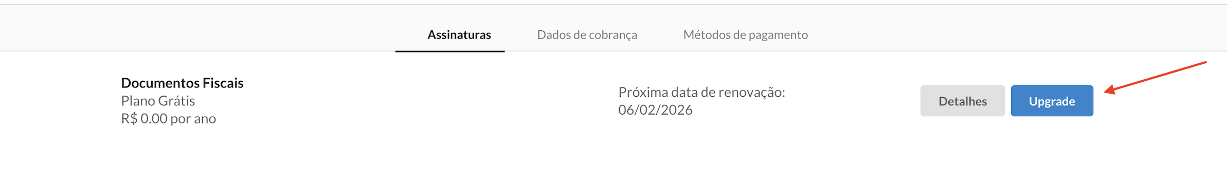 Após logar na sua área do cliente, localize a sua assinatura e clique no botão “Upgrade”, conforme imagem a seguir: